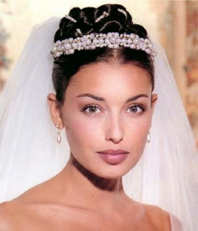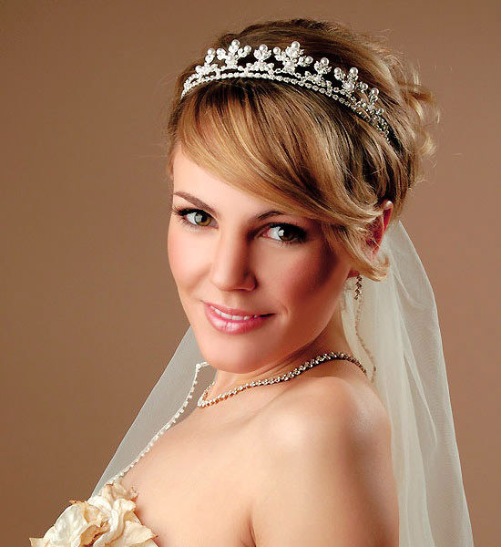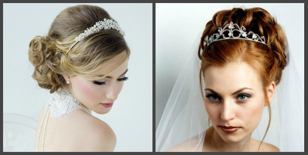 Для свадьбы в классическом стиле можно выбрать не только диадему, но и более скромную тиару. В отличие от незамкнутой диадемы конструкция тиары замкнутая, но какое украшение выберите вы – решать вам. Под тиару короткие волосы завивают и укладывают крупными волнами.