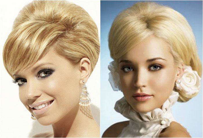 Короткие волосы с помощью таких пучков визуально кажутся объемными и пушистыми. Пряди на теменной части головы подкручивают, делают начес и завязывают в небольшой хвостик. Пучки украшают праздничным декором.