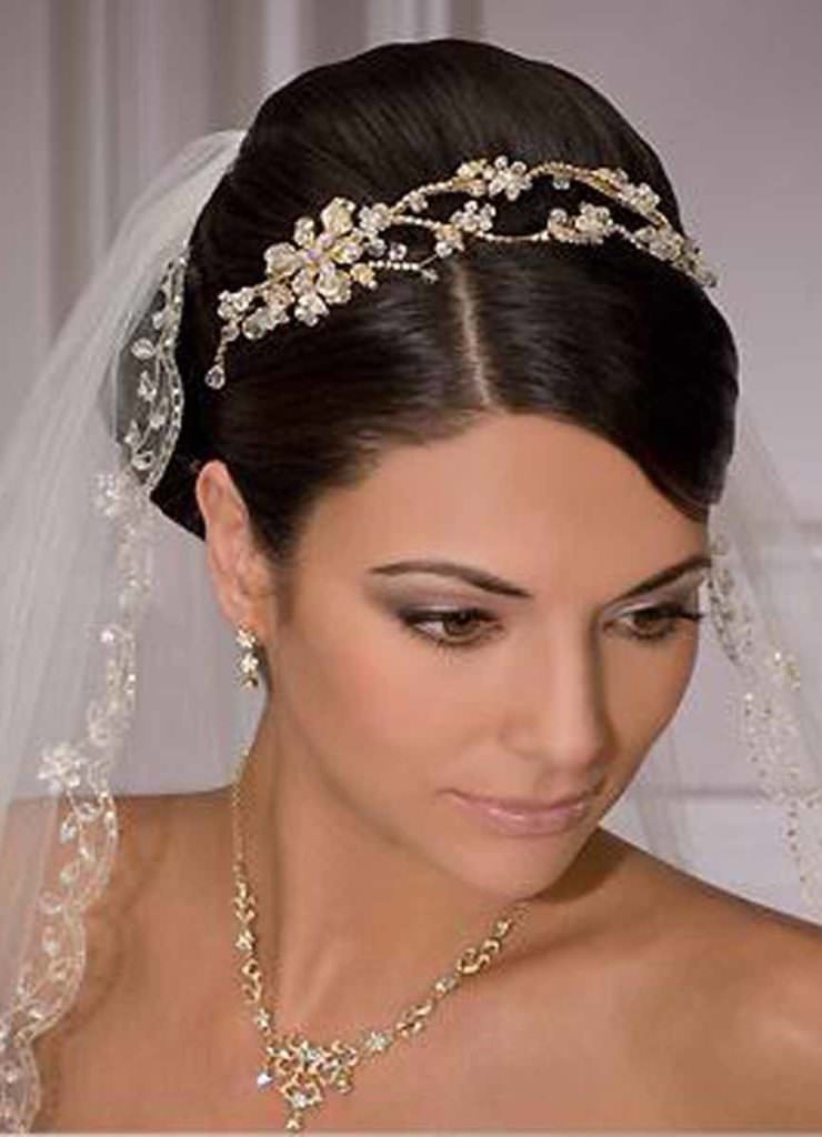 Повязка на голову может быть очень лаконичной и сложной, например, в виде ленты или невысокого жемчуга. Или наоборот посыпаться цветами и бусинками. Свадебный обруч можно носить так, что под ним убирается бахрома. Если при этом слегка зачесать волосы на макушке, прическа станет выше.