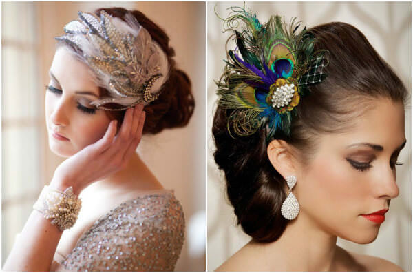 Прикрепленные сбоку к прическе цветы и перья подчеркнут очарование своей обладательницы. Для гармонии образа рекомендуется подбирать этот аксессуар в том же цвете, что и платье