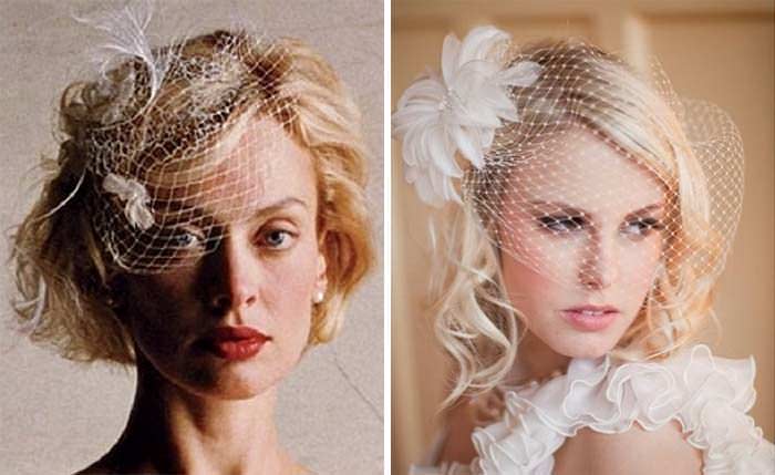 Шляпка или вуаль будут идеальными дополнениями к асимметричной прическе, а также к каре. Вуаль в сочетания с ретро волнами — настоящий ретро-шик. Крепят вуаль или на макушке, или слегка сдвинув набок.