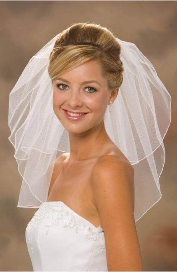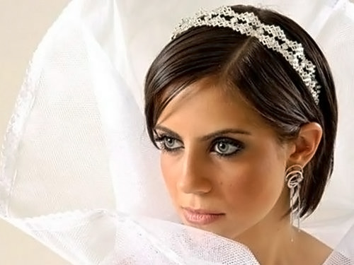 Для коротких волос выбирают аксессуары длиной чуть ниже плеч. Модели из тяжёлых тканей и кружева не требуют дополнительного декора. К более простым вариантам добавляют тонкую изящную диадему или тиару.