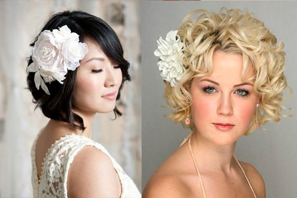 Идеальный вариант для коротких волос – прическа с цветами. Такие образы выглядят очень женственно и нежно, символизируя близость к природе. Цветы для украшения прически можно использовать во всех вариантах – в греческом стиле, пучках, при распущенных волосах. В каждом из вариантов невеста будет иметь нежный и соблазнительный образ.