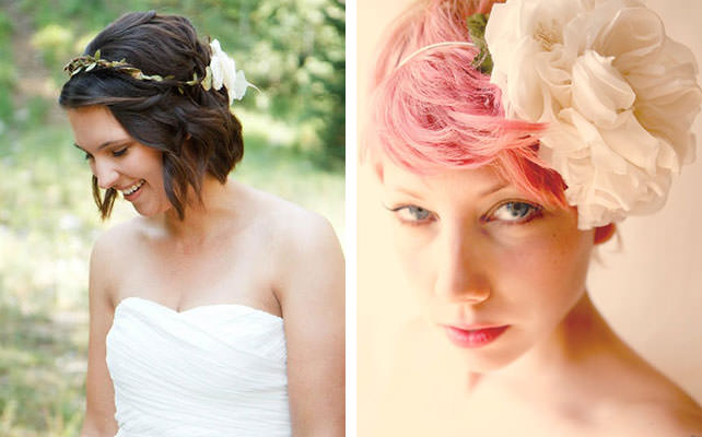 Сегодня модной тенденцией становятся варианты украшения невесты романтическим венком из нежных бутонов и жемчужин с блестками. Цветы могут быть пастельных тонов или, наоборот, яркими. Их можно закрепить в прическе с помощью шпилек, что не очень надежно для коротких волос, или тонкими проволочками.