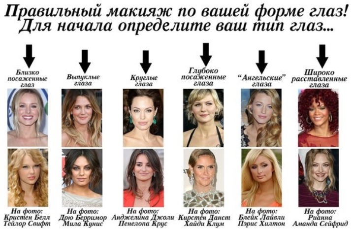 Оцените глаза по глубине их сидения. Глубокие как бы зарылись в глазницы и слегка затемнены веком, которое, кстати, маленькое и темное. Большие выпученные глаза с широким веком похожи на выпуклые и буквально заметны с первого взгляда. Если вас это не беспокоит, рекомендуем перейти к следующему шагу и определить форму глаз. Сравните их с губами. Среднего размера, по форме и размеру напоминает рот (может быть немного меньше), имеют овальную форму. Раскосые (узкие) глаза сможет определить с первого взгляда любая девушка или мужчина – они имеют небольшую ширину и выпирающее веко. Монголоидный макияж глаз существенно отличается от запавших или расставленных глаз