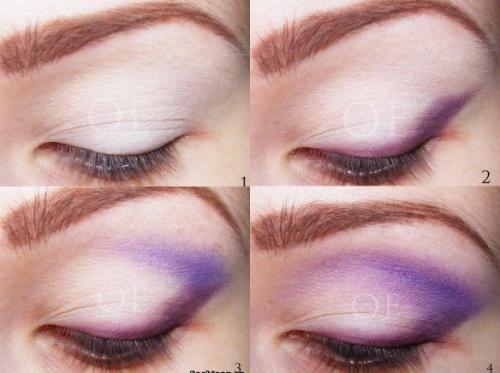 Карандашом сделать линию для стрелок. Нанести на верхнюю и на нижнюю часть века тени фиолетового цвета , немного растушевать.