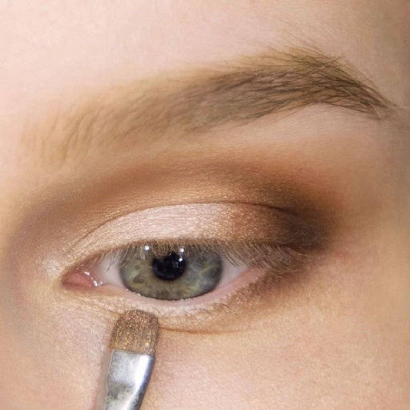 - средним цветом из палетки теней коричневого оттенка прокрасить верхнее веко, глядя строго вниз;