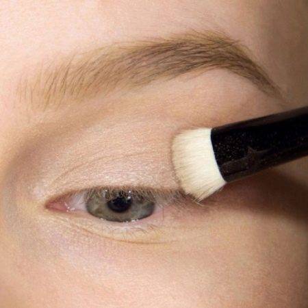 Наносим базовые светлые тени на подвижное веко кисточкой.