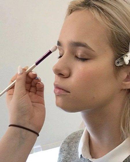 - цвет теней предпочтительно выбрать естественного оттенка: пудровый, светло-бежевый;