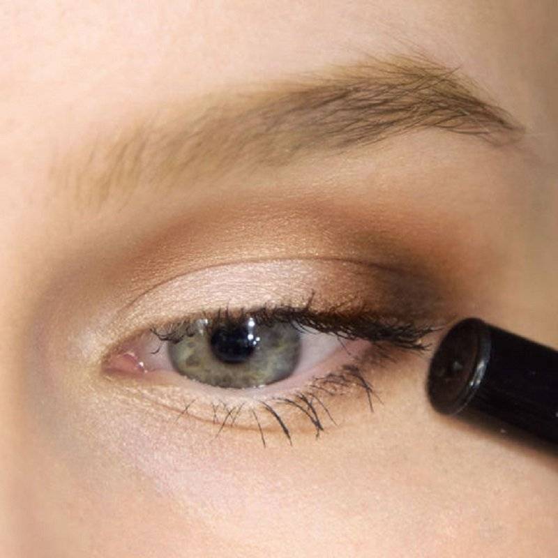 - Нанесите на веки тени или оформите контур подводкой (карандашом). Если предпочитаете использовать тени нескольких цветов, избегайте резкого контраста. Мягко растушуйте тени, не пытаясь задать четки грани — это уже превышает нормы дневного макияжа.