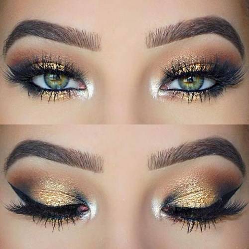- Золотые тени – для дневного мэйкапа это слишком ярко, так как на солнце желто золотистый блеск будет излишне переливаться. Зато качественный вечерний вариант у каре-зелёных и оливковых глаз без золота не обойдётся.