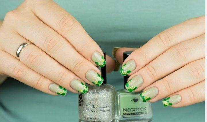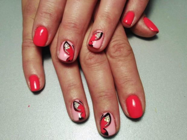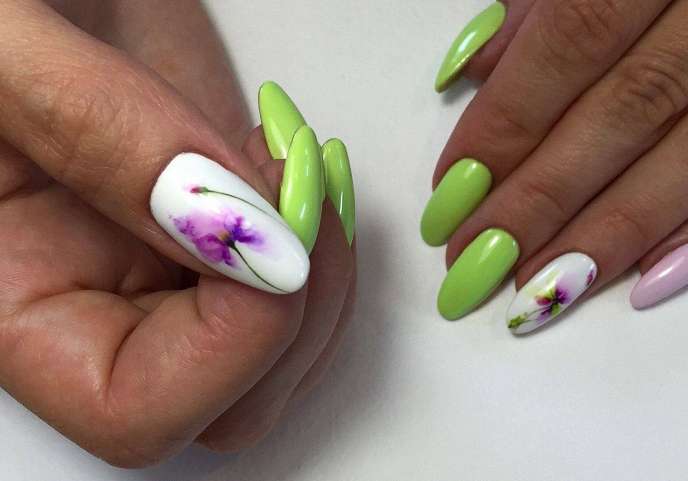 Еще один интересный вариант – на одной руке ногти окрашены однотонным цветом, на второй руке на прозрачной или белой основе нанесены рисунки с помощью наклеек в тон цвету первой руки. Хорошо смотрятся веточки, цветы, абстрактные картинки.