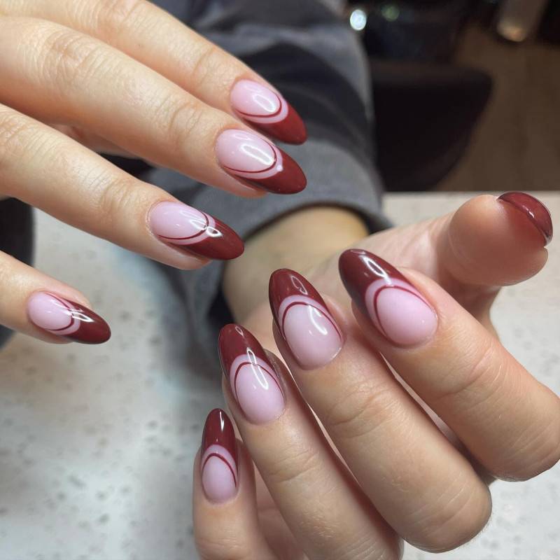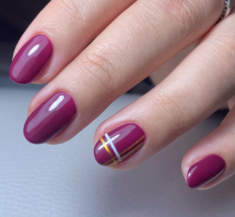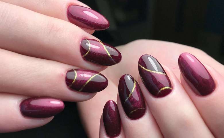 Популярен в 2023 году в виде минимализма. Бордовый, винный и вишневый актуален с длинными и короткими ногтями.