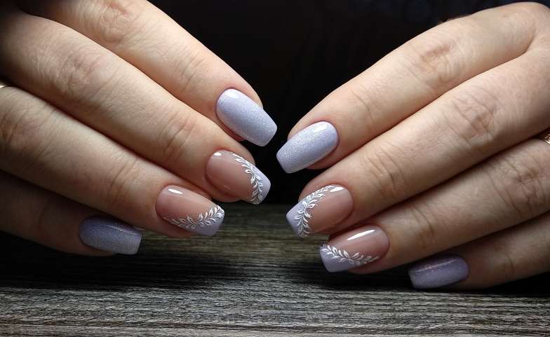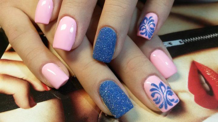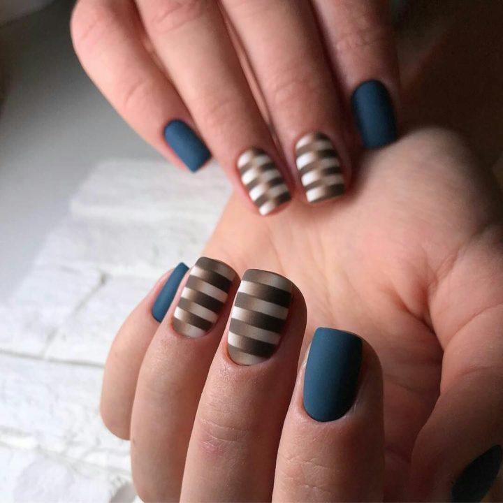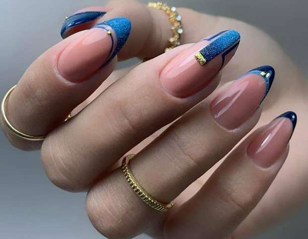 Самый глубокий цвет, комбинируется с белым тоном. Синий оригинально смотрится в маникюре с красным и чёрным. Светло-серый и синий подойдёт для будней и официальных торжеств.