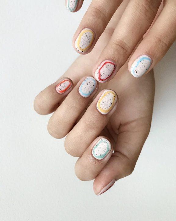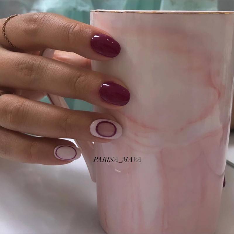 Он предполагает нанесение на ногтевую пластину лака или краски кружком. Рамка может иметь любой цвет, а серединка другой. Еще экспериментируют с шириной рамки, в одном варианте делая ее шире или уже, а в другом создавая неровные края.