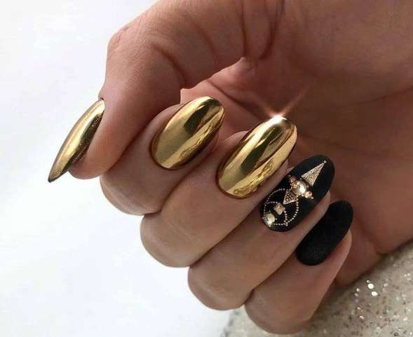 Золотые элементы будут хорошо сочетаться с абстрактными рисунками, а также с нейл-артом на зимнюю тематику.️️