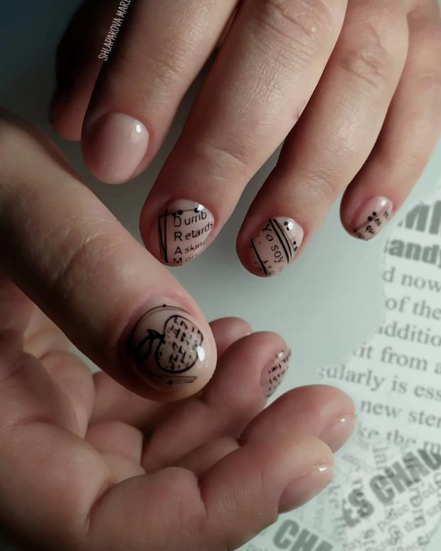 Надписи могут украшать не только одежду или сумку. Как на счет ногтей? Безусловно, у вас есть, что сказать этому миру, поэтому нанесите надпись на один или несколько ногтей.