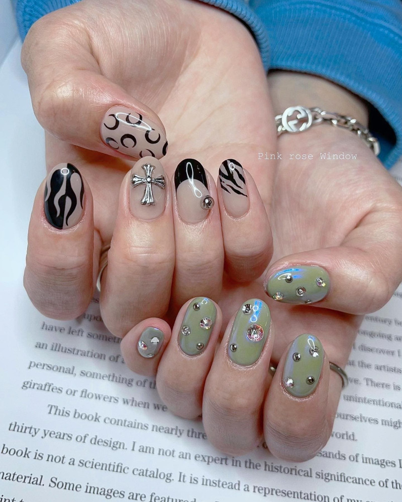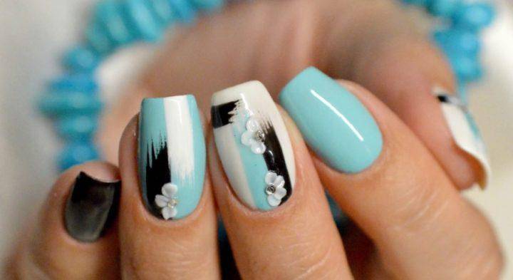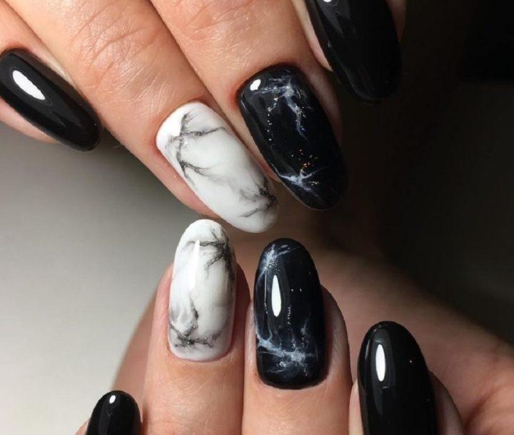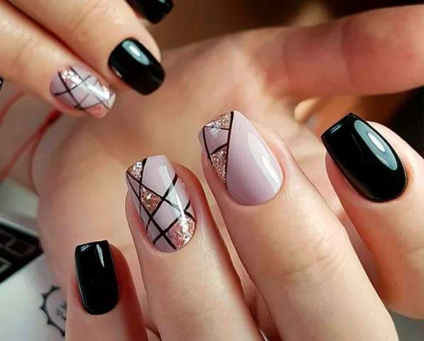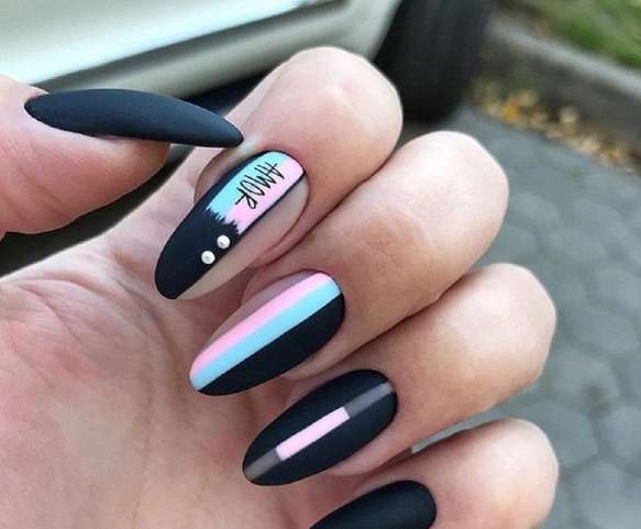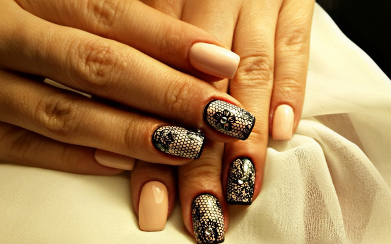 Теперь, если вам одновременно хочется и нежный маникюр, и оформление в черном цвете, проблема решается легко: разный маникюр на руках. Более того, каждый палец можно украсить «своим» маникюром.