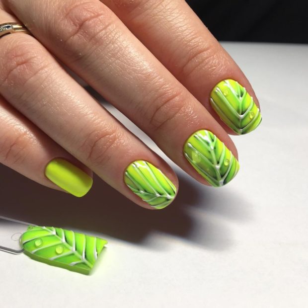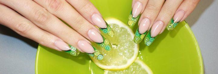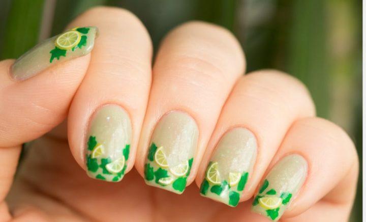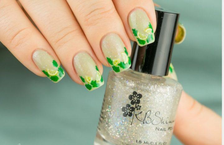 Нежные нотки лимона и лайма формируют яркий и привлекательный маникюр. Кружочки лайма мастера рисуют на зоне улыбки используя френч. В другом варианте на ноготках изображают стаканы с мохито и трубочками. Весьма летний маникюр, который точно впишется в ваш летний отдых на море.