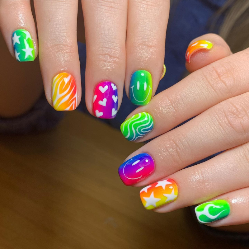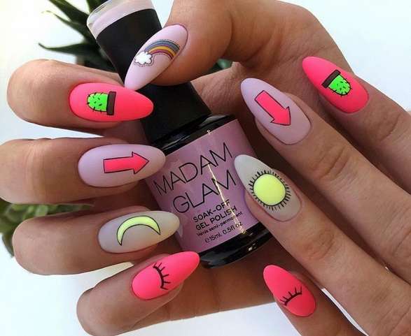 Интересный вариант маникюра, который предполагает окрашивание каждого ноготка в отдельный цвет. Непринужденный вид маникюра подойдет больше всего на летний период, когда вы сможете подбирать цвета под ваш купальник или разноцветное платье.