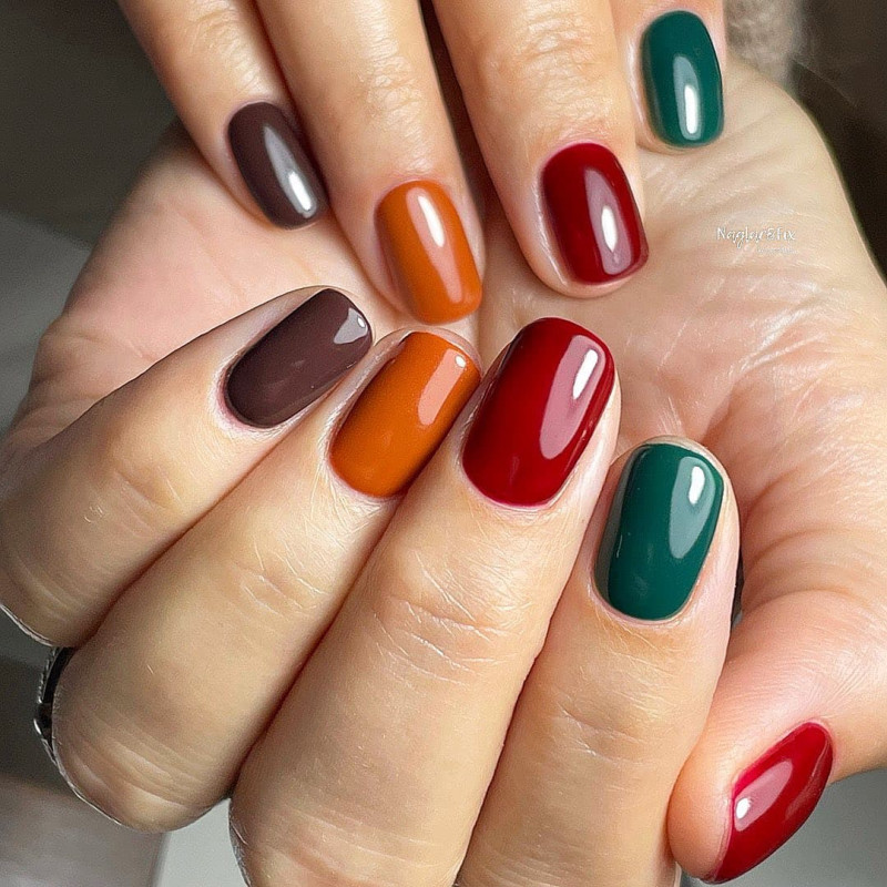Когда душа просит чего-то простого, но при этом хочется добавить оригинальных деталей, выбирай разноцветный маникюр. Ты можешь выбрать расцветку в духе трендового дизайна ногтей 2024 — яркие цвета — или же ограничиться спокойными оттенками. Главное правило: все они должны быть из одной цветовой гаммы и быть либо теплыми, либо холодными.