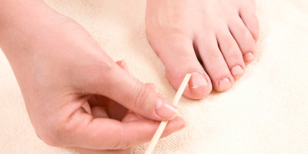 Обработка зоны кутикулы. Не рекомендуется обрезать кутикулу – она легко повреждается, провоцируя кровотечение. Возьмите апельсиновую палочку, и аккуратно её отодвиньте. Нанесите на кутикулу смягчающий крем или масло. Потом ногти на ногах следует обрезать и подпилить пилочкой, стараясь не закруглять края, чтобы растущий ноготь не врос в кожу. Удалите грязь под ноготками, тщательно их вычищая.
