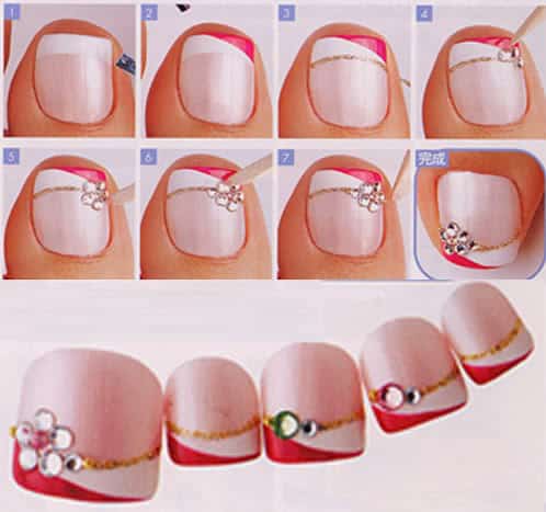 - Если вы решились сделать красивый дизайн ногтей, придется потратить больше времени. Каждый вариант дизайна нужно выполнять пошагово. Например, к стемпингу прилагается специальная инструкция, как отпечатывать рисунок. Не нарушайте правила педикюра, чтобы избежать повреждений ногтей.