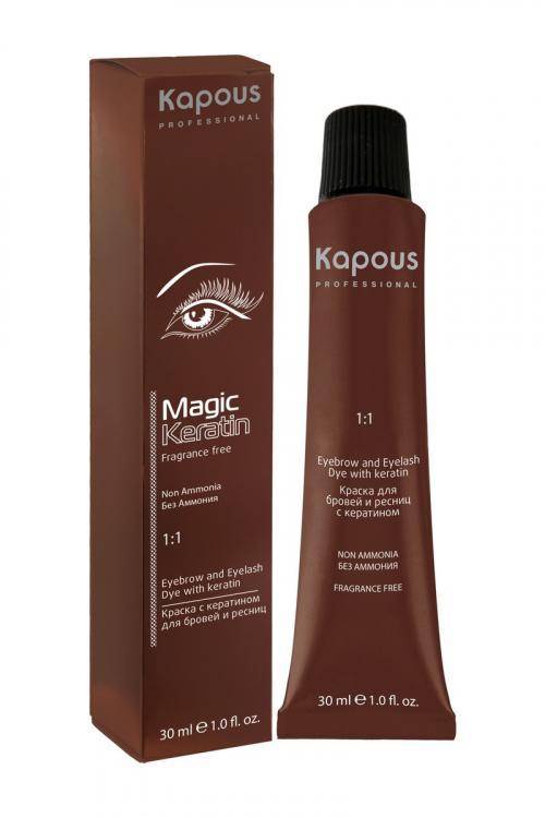 Kapous Magic Keratin не содержит в своем составе аммония, фенилдиамина и парфюмированных добавок. Обладает ультрамягкой формулой и устойчива к воздействию воды и солнца. Краска станет отличным выбором в летний период. В цветовую палитру средства вошли: черный, иссиня-черный, коричневый и графитовый. Обьем тюбика — 30 мл.