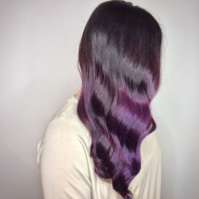 Красно-фиолетовое омбре – вариант для шатенок или брюнеток; неплохо он смотрится и на русых волосах, а вот блондинкам от него лучше отказаться, велик риск выглядеть слишком вычурно.