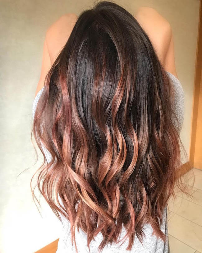 А если вы не хотите выделяться из толпы излишней яркостью, кончики прядок можно осветлить в полутона, близкие к вашей родной палитре, выбирая медово-кофейные или карамельно-коньячные варианты.