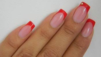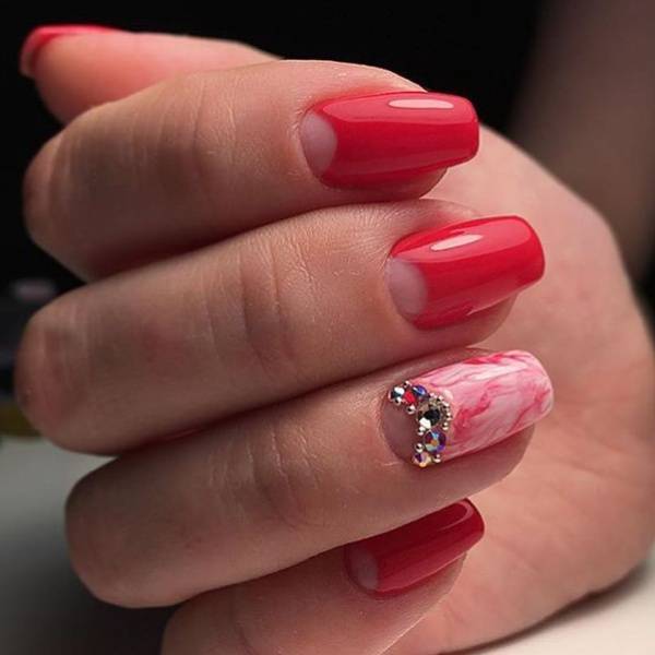 - Элегантное сочетание страз разного размера на красном фоне. Можно выполнить французский маникюр в красно-белых тонах и декорировать мелкими стразами линию улыбочки. Или выделить ее серебряной фольгой.