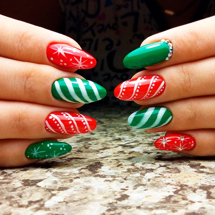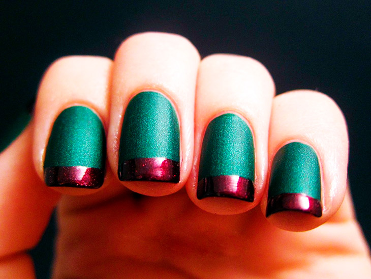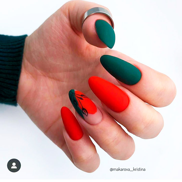Делая красный маникюр с изумрудный, надо быть готовой к тому, что зеленый может «переключить» внимание на себя, однако в сочетаниях с украшениями, обувью или сумочкой, этот альянс смотрится очень модно