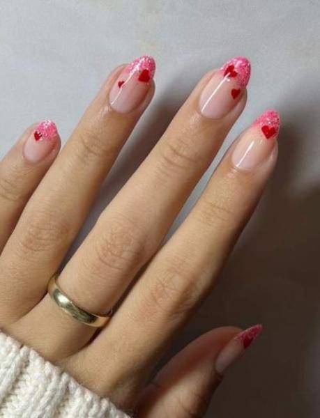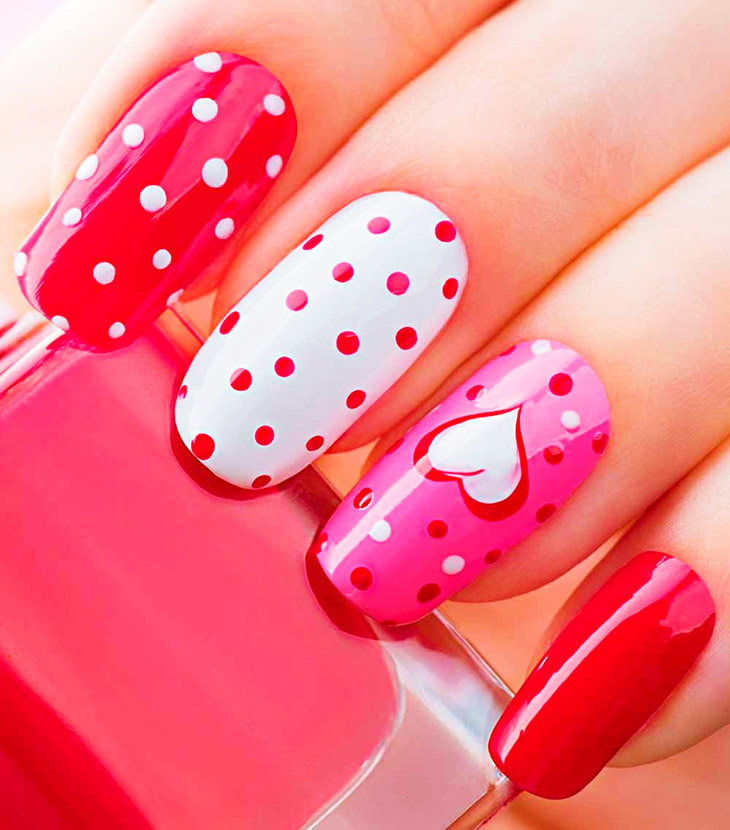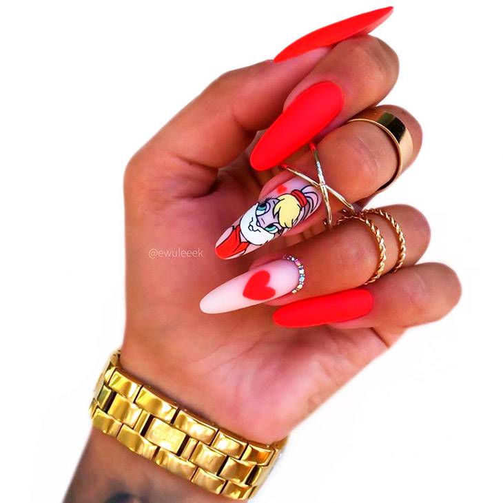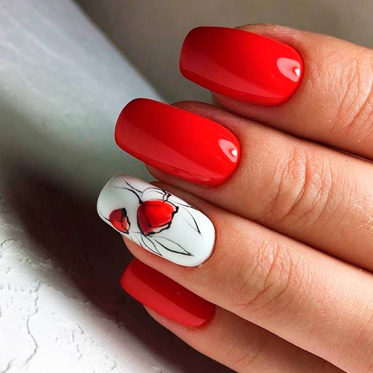 Сердца часто работают как романтичный и женственный нейл-арт: красный, черный, белый, блестящий. Так что украшайте ими алый маникюр не только на праздники.