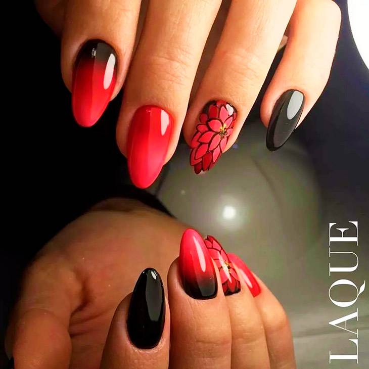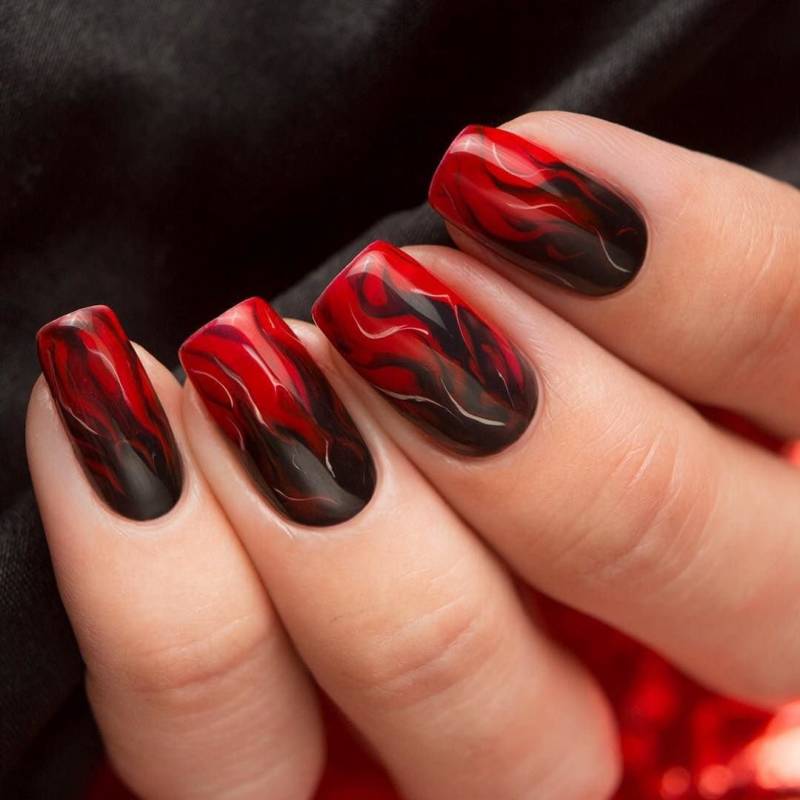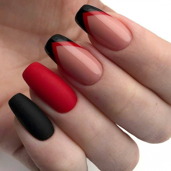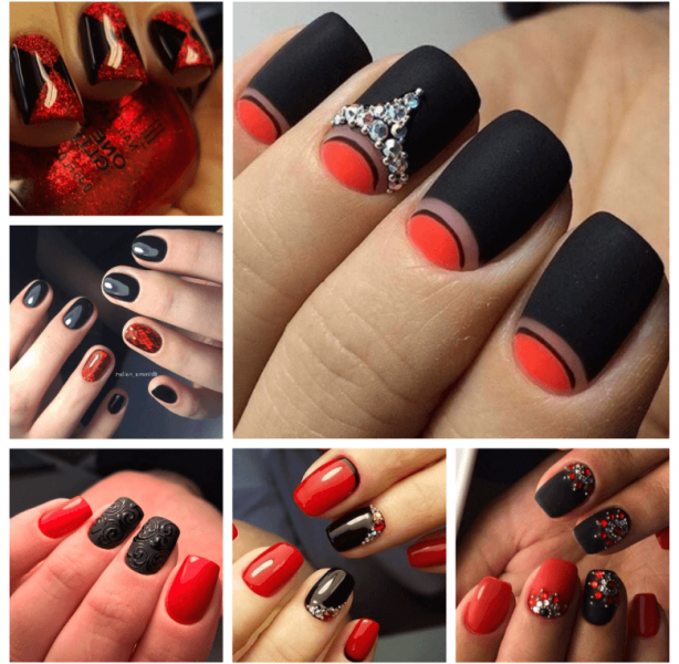 Женщины, жаждущие выделиться на фоне окружающих, часто совмещают красный и чёрный оттенок. Сочетание визуально увеличивает ноготь, делает его форму более вытянутой, изящной. Есть 2 способа комбинирования цветов: