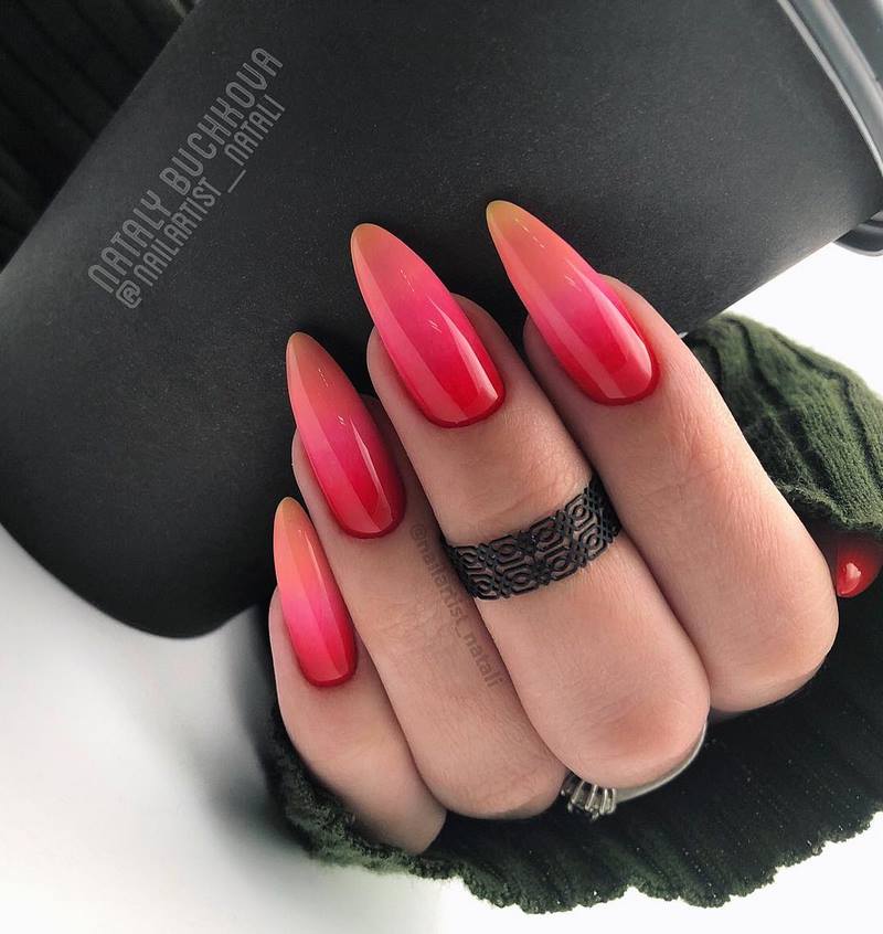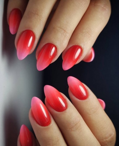 Очень свежо и неизбито выглядит техника градиент или омбре: в виде цветной растяжки от цвета бледнее к насыщенному, или же наоборот. Плавные цветные красные переходы можно делать как в вертикальной плоскости, так и в горизонтальной. Для этой техники применяют от трех цветов лака до семи. Чем больше лаков, тем интереснее будет играть цветовой переход.