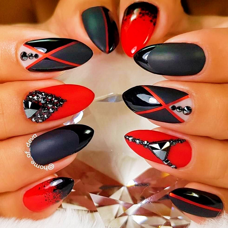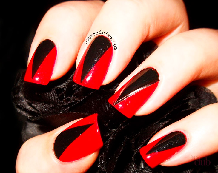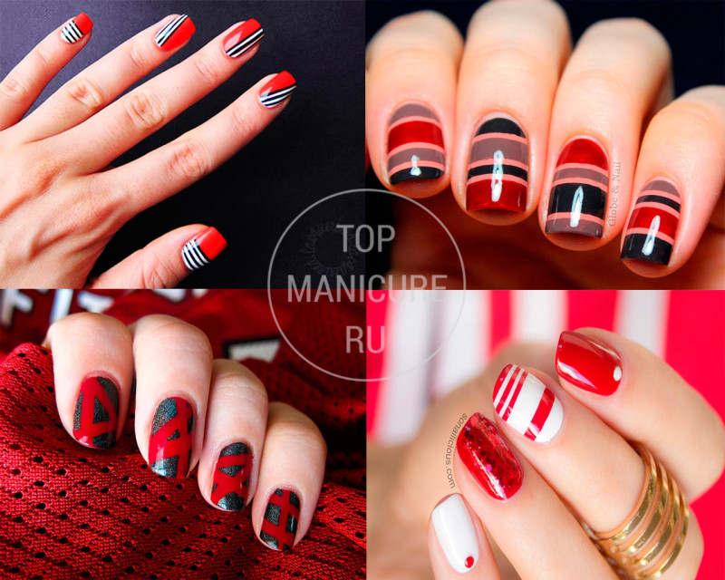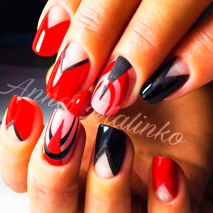 Красный лак в сочетании с черным цветом выглядит весьма необычно, а потому часто используется для создания на ногтях оригинального маникюра. При этом для каждого случая можно подобрать свой вариант дизайна, который будет смотреться по-разному.