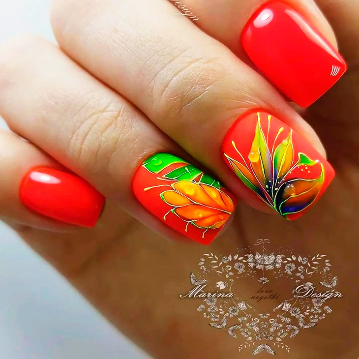 Оранжевый цвет очень близок к красным оттенкам, потому можно без сомнения добавлять его в дизайн ногтей. Все оттенки оранжевого создадут летнее, солнечное настроение в любое время года. Это может быть как отпускной пляжный вариант, так и праздничный выбор оформления ногтей.