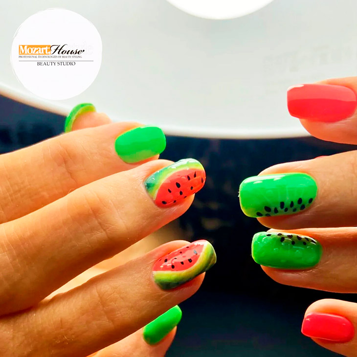Разнообразные рисунки также давно остаются в моде. Для весны прекрасно подойдут рисунки с природными мотивами, которые подчеркнут лёгкое весеннее настроение, а также яркая абстракция и подобные ей техники. Для выполнения летнего дизайна существует множество вариантов рисунков, так как это та пора года, в которую особенно хочется выделиться и поэкспериментировать со своим образом. Нарисуйте сочные фрукты и цитрусовые, зелёные пальмы, разнообразных животных, берег моря и красивые закаты. Осенний маникюр отличается своей теплотой и некоторой официальностью, так как это та пора года, в которую многие девушки выходят на работу и в школу. Сделайте минималистичный дизайн, используя стемпинг, или нарисуйте простую, но стильную геометрию. Зимой же вы смело можете порадовать себя рисунками с зимними и праздничными мотивами: всевозможными новогодними рисунками и снежинками.
