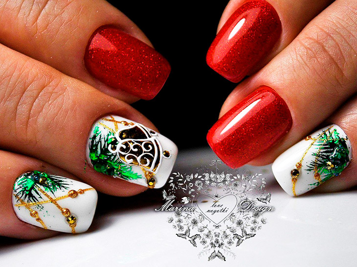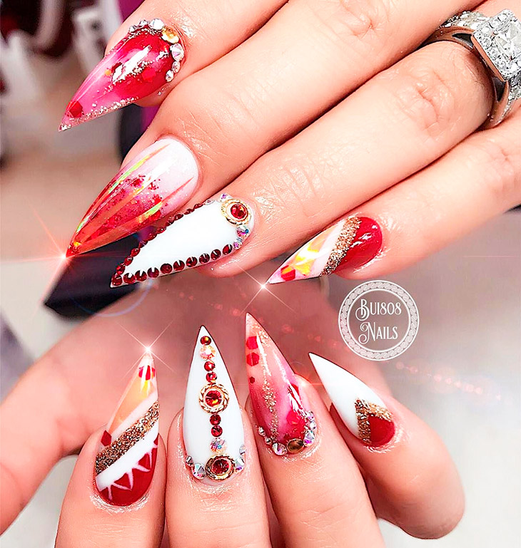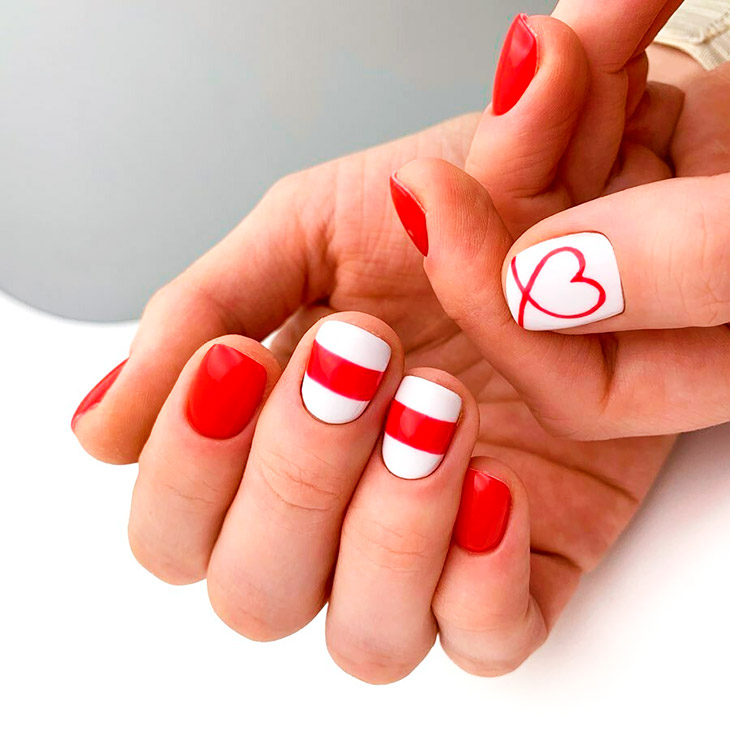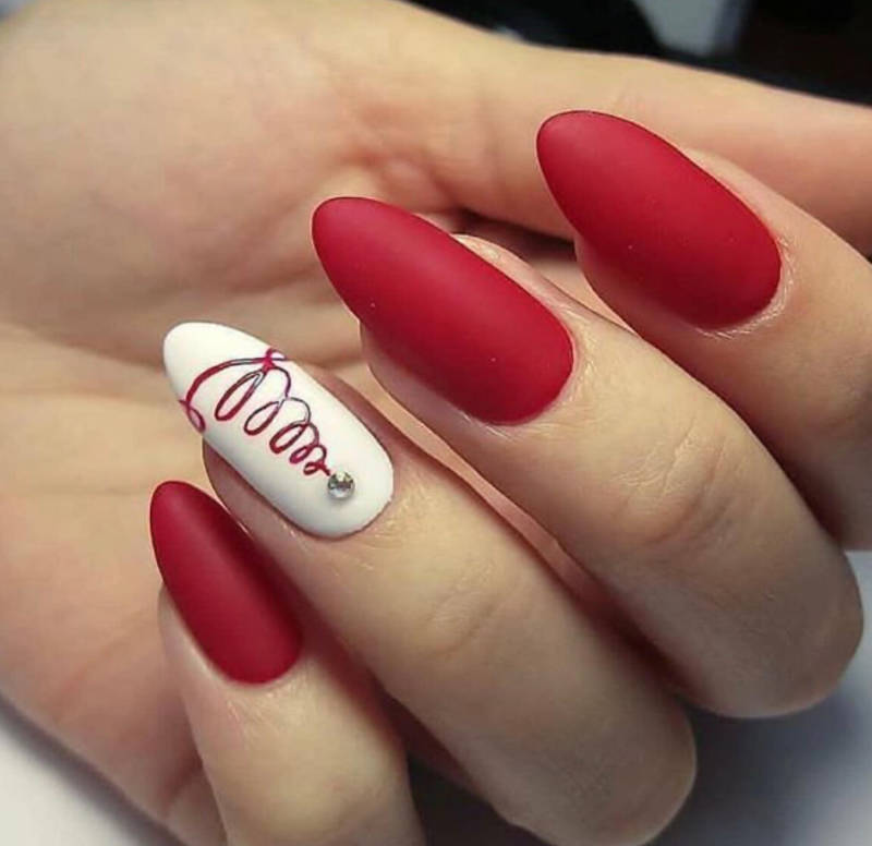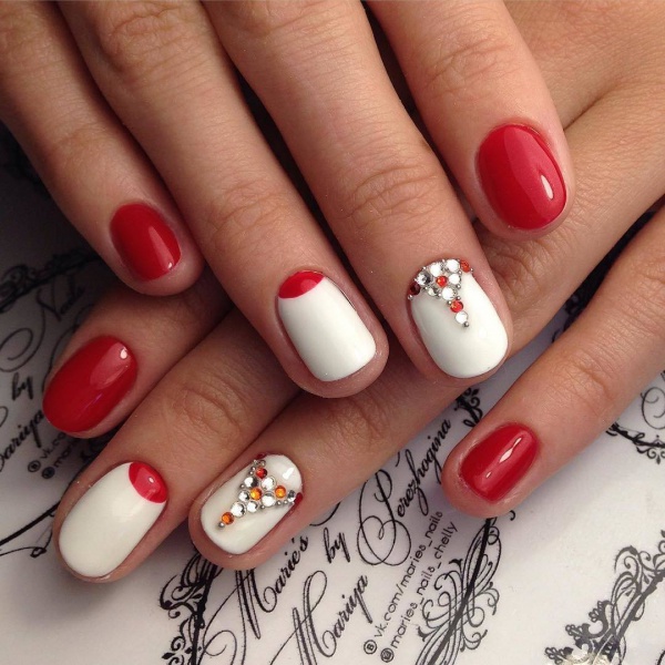 Сочетание красного и белого цвета подходит как для праздника, так и для повседневной жизни. Чтобы усовершенствовать дизайн, стоит применить технику объёмного рисунка. Украсить 1 или 2 пальца стразами, камнями.