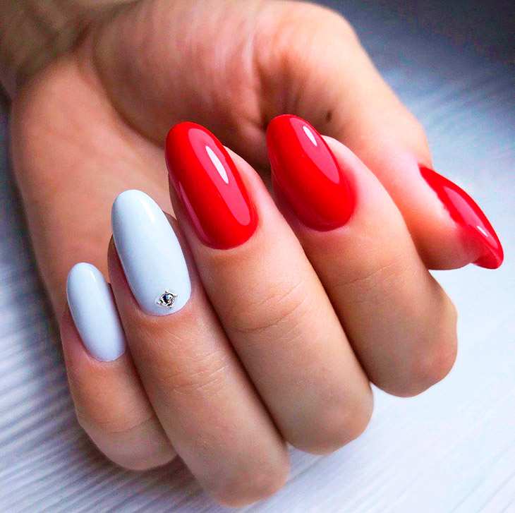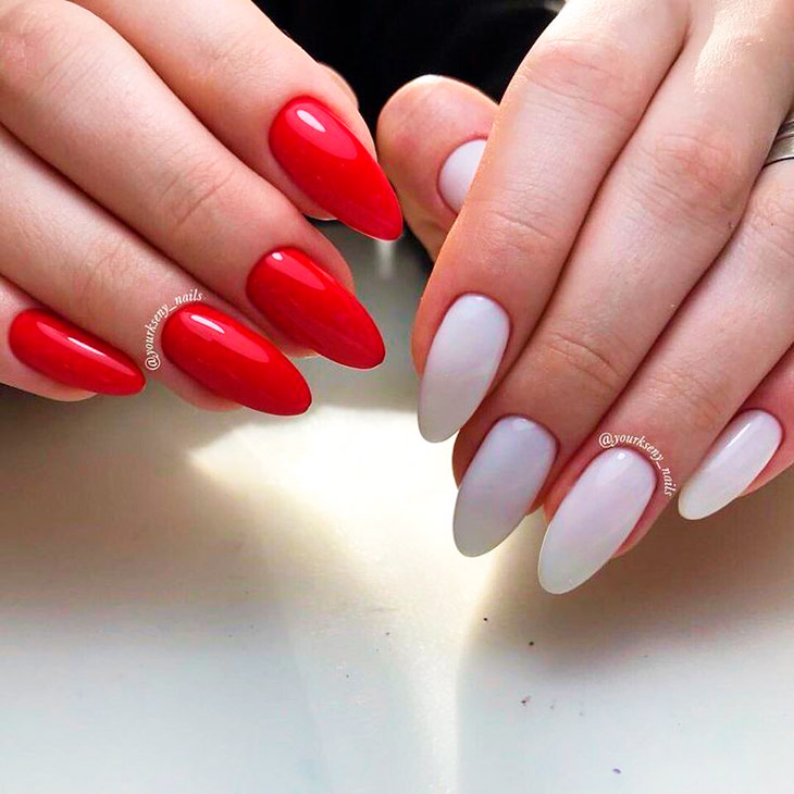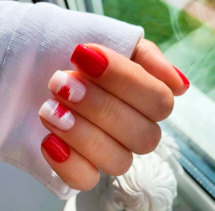 Красный маникюр в комбинации с белым смотрится очень красиво и модно. Этот тандем подходит практически всем, ведь красный цвет может быть разным: от цвета бургундского вина до ярко-красного.