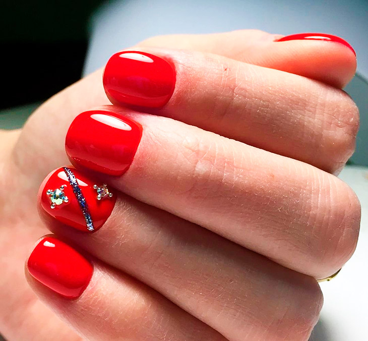 Маникюр в красном исполнении часто дополняется различными аксессуарами. Например, стразами или фольгой. Среди новинок отмечают и покрытие в виде переливающихся полосок. По словам дизайнеров, в нем есть как минимум четыре преимущества: