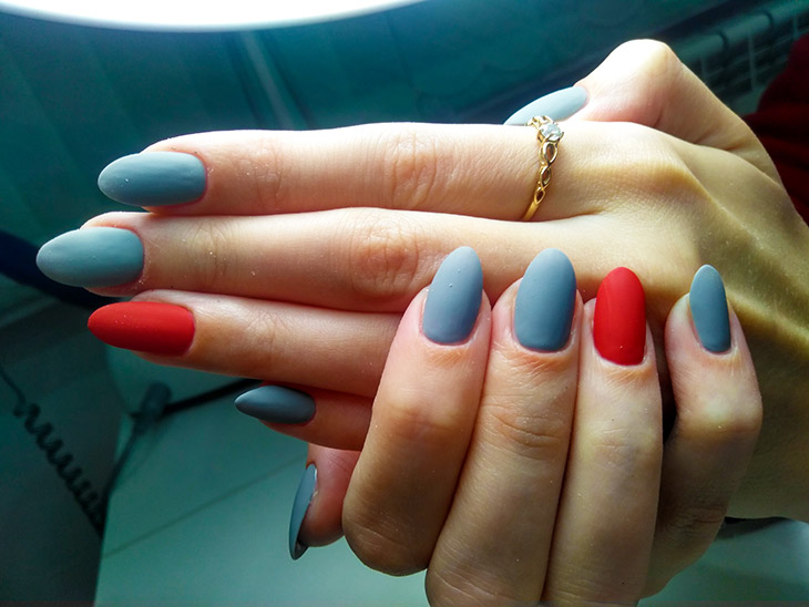 Красный маникюр в союзе с синим и голубым, далеко не всегда выигрывает. Тут надо подбирать буквально вручную. Глубокий синий с алым – однозначно неплохой вариант, как и коралловый, оттененный цветом морской волны или нежно-голубым классическим.