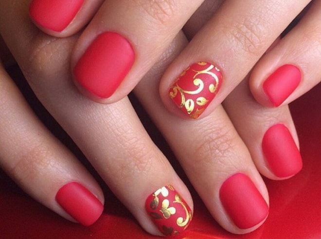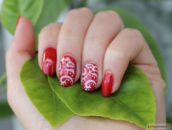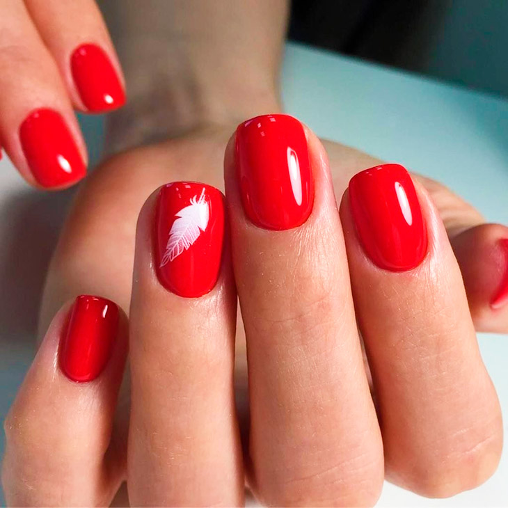 Те, кто любит красные ногти средней длины, могут все время экспериментировать с дизайном. Варианты лаконичного шикарного оформления: глянцевый алый топ, украшенный изящными золотыми наклейками в виде вензелей и растений, нежная роспись светлыми тонами (можно акцентный ноготь сделать в нюдовых тонах, а белую роспись пустить по нему и алому полю).