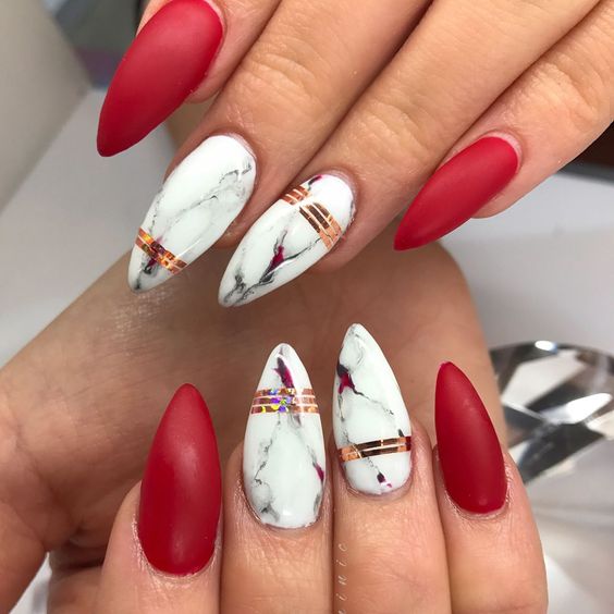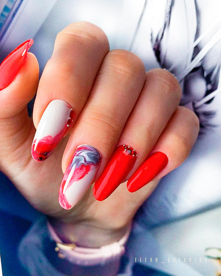Такой дизайн обычно выполняется в «холодных» оттенках: белом, сером, черном, жемчужном. Сочетание нескольких ногтей, покрытых в стиле мраморного узора, и насыщенно красного цвета на остальных ногтях сделает нейл-арт броским и стильным. Плюс такого дизайна в том, что при всей своей выразительности и привлекательности он достаточно лаконичный.