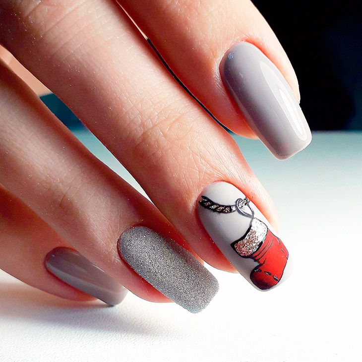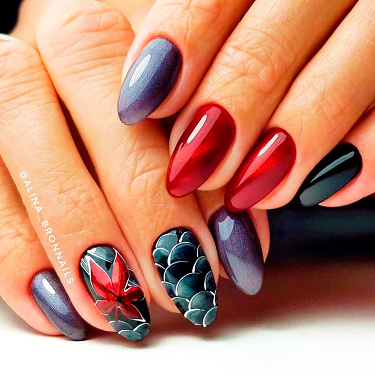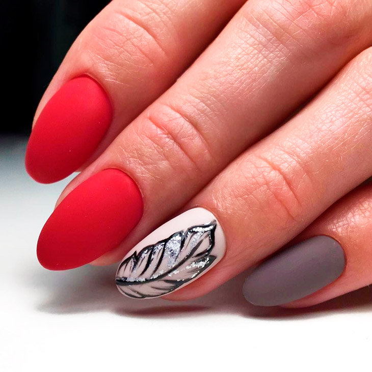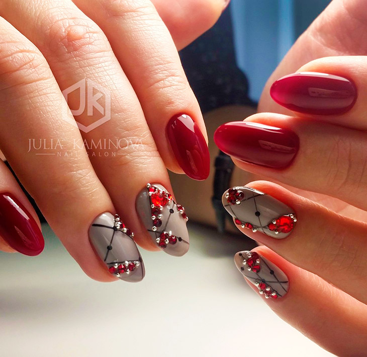 Заиграть новыми оттенками и, как хамелеон, становиться то празднично-нарядным, то по-деловому спокойным сможет красный маникюр с серым. Чем темнее дерзок оттенок, тем темнее должен быть и серый – разбавить его помогут полосы белого и черного цвета, серебряные параллельные или перпендикулярные линии.