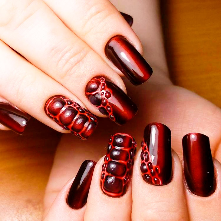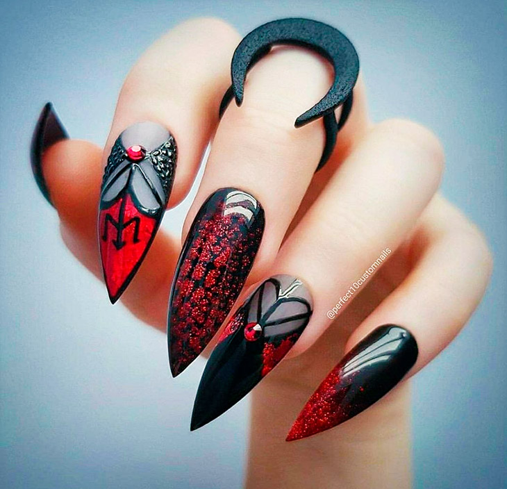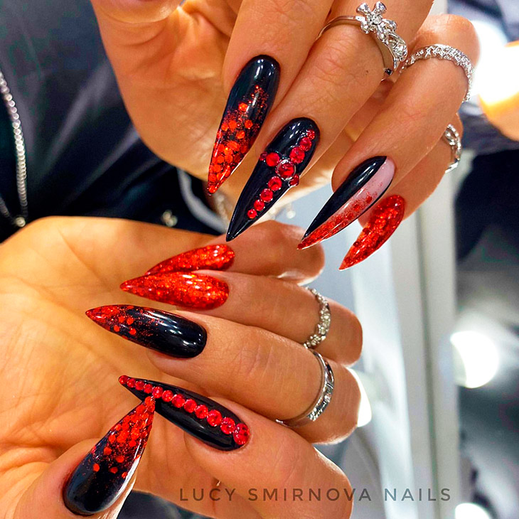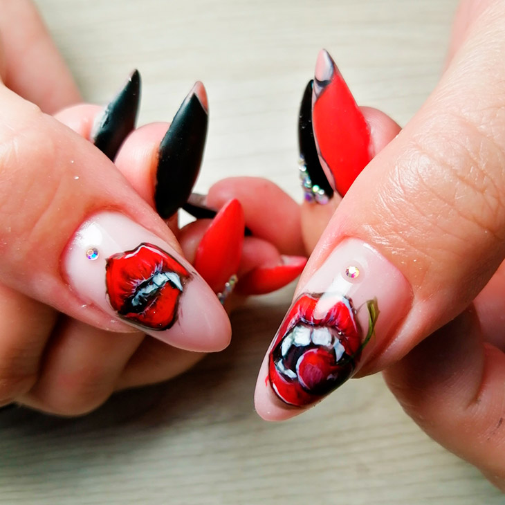 На длинных красных ногтях гораздо удобнее делать объемные и насыщенные дизайны, благо, есть из чего выбрать. Переходы цвета в сочетании «красное-черное», когда лунулы выложены бульонками или мелкими стразами, сразу же вызывают ассоциации с дерзкой страстью и танго.