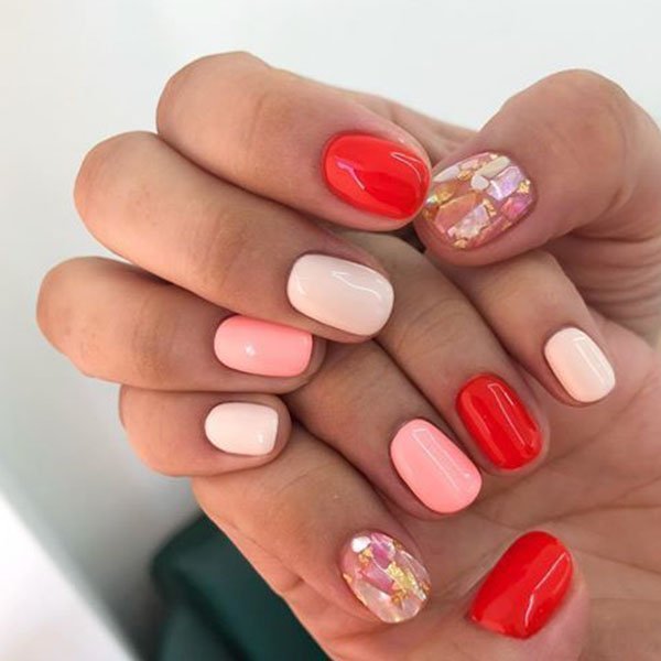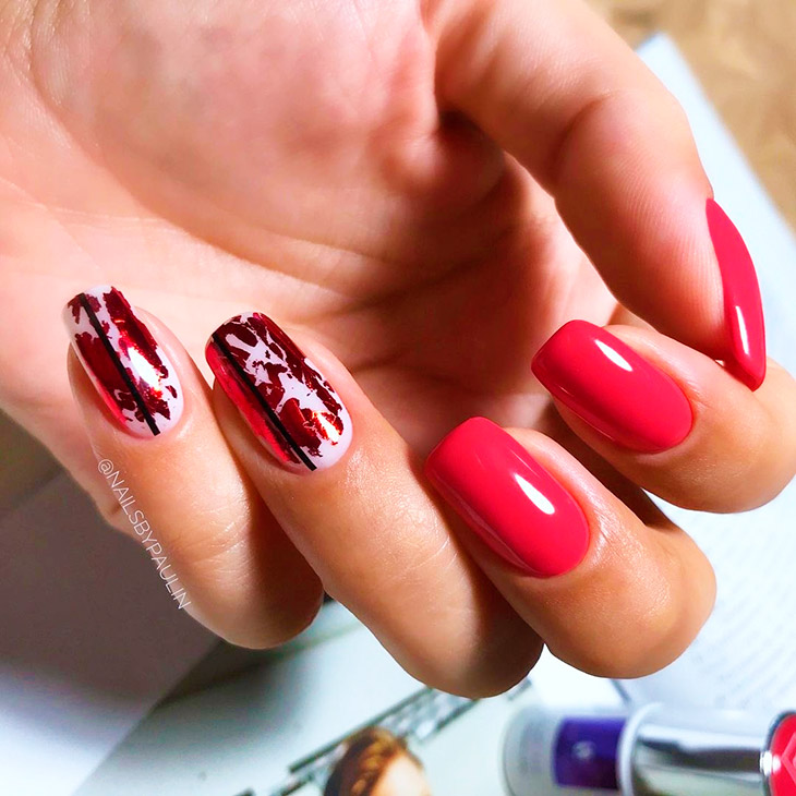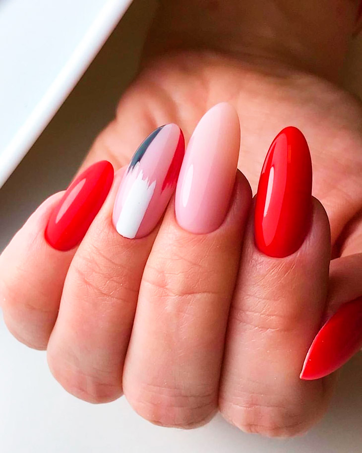 Поклонницы яркого маникюра могут комбинировать эффектный красный с другими цветами.
