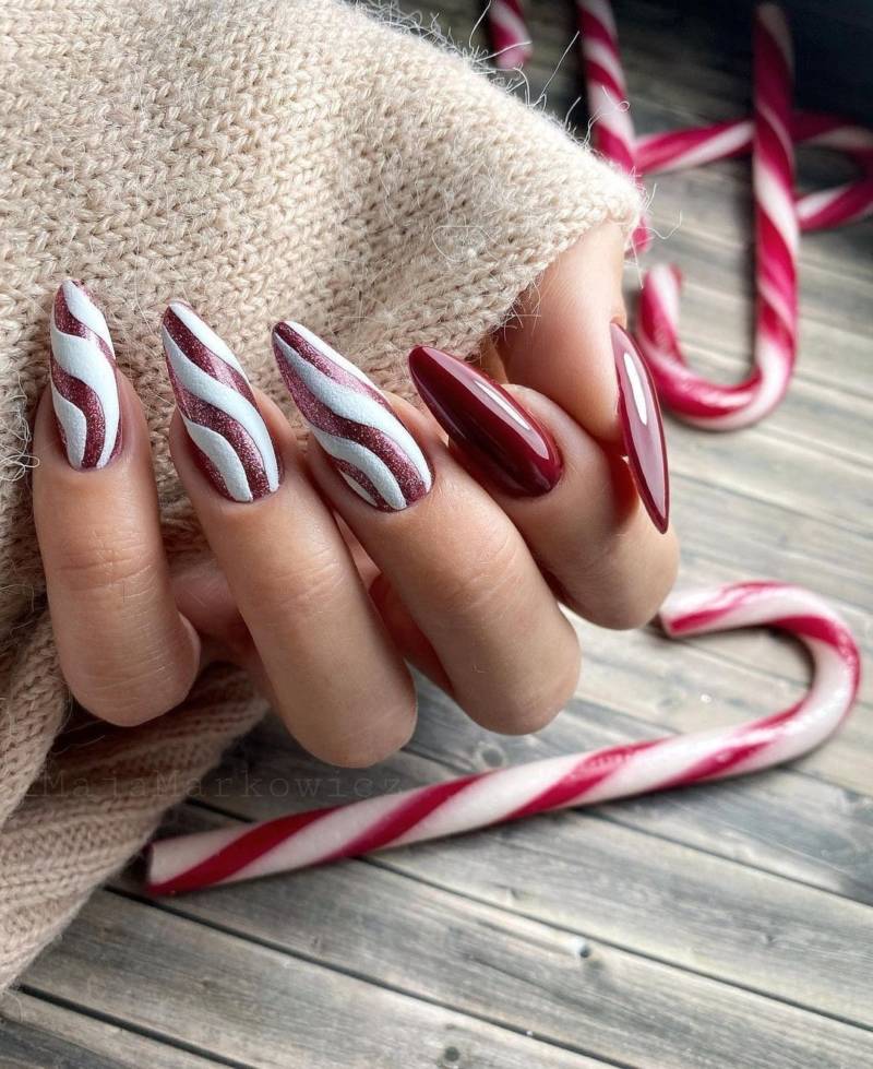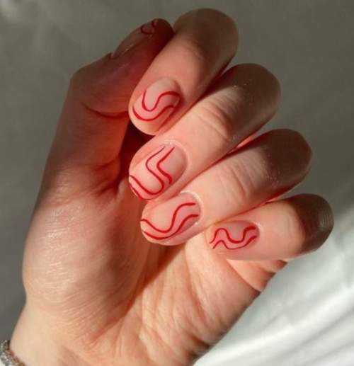 Еще один модный дизайн – «волны» превращаются в модный нейл-арт благодаря не только красному цвету. Такие рисунки в виде тонких волнистых линий уже второй сезон в тренде. Стильно и позволяет создавать дизайн на коротких и длинных ногтях, а также разные идеи.