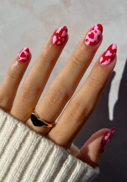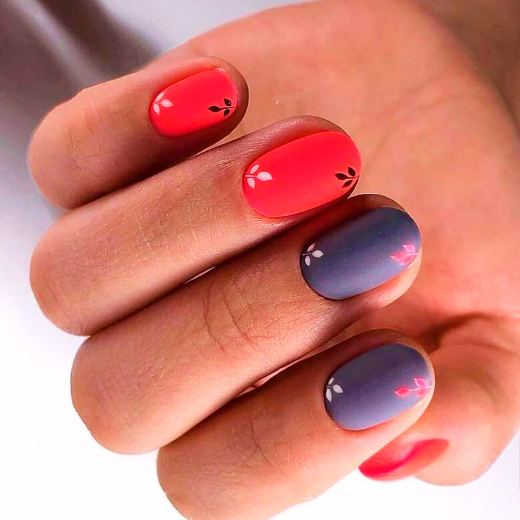 Вариант сложный, подойдет не каждой даме, поскольку цвета плохо гармонируют между собой. Для создания красивого дизайна применяют связывающие элементы в виде дополнительных оттенков: нежно-зелёного, чёрного, белого, серого. В качестве украшения красно-розового покрытия акцентируют безымянный палец объёмным рисунком.