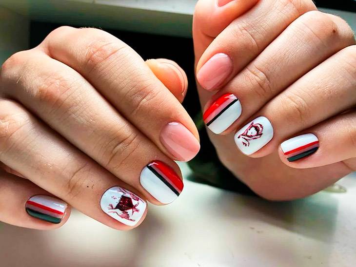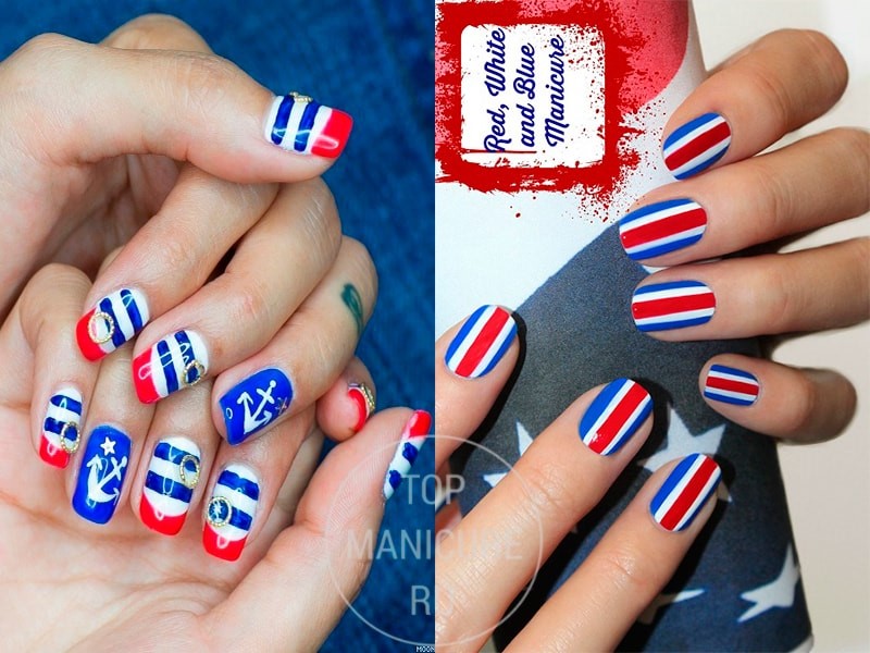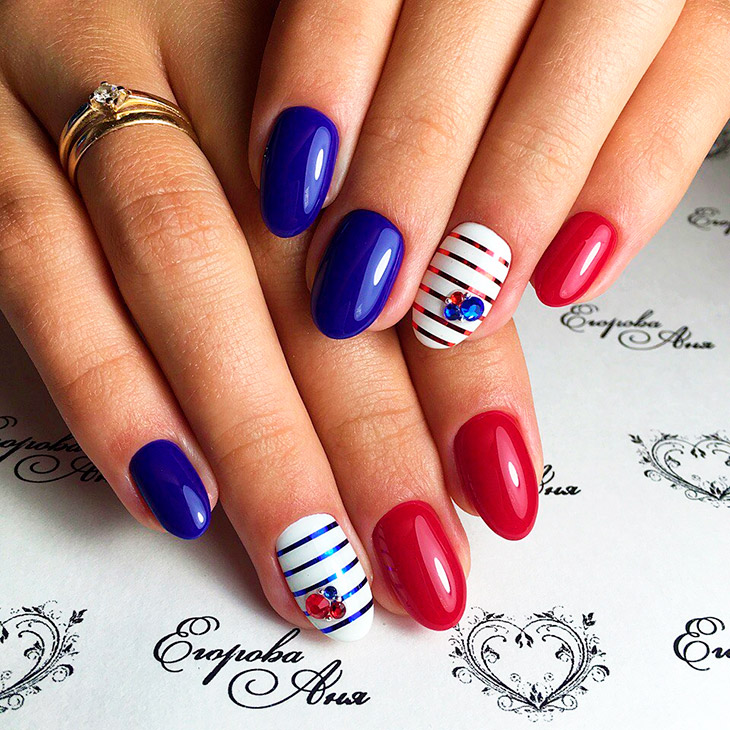 Еще одно интересно сочетание это красно-голубой маникюр с белым лаком в полоску. Такой дизайн ногтей очень напоминает морскую тематику, поэтому его можно украсить якорями.